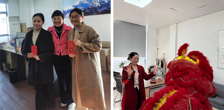 在舞狮欢腾、锣鼓喧天的喜庆氛围中,集团董事长梅飞珍为美博家人送上满满的红包传递新年的祝福与温暖,祝愿大家在新的一年“钱路”亨通,“钱程”似锦!